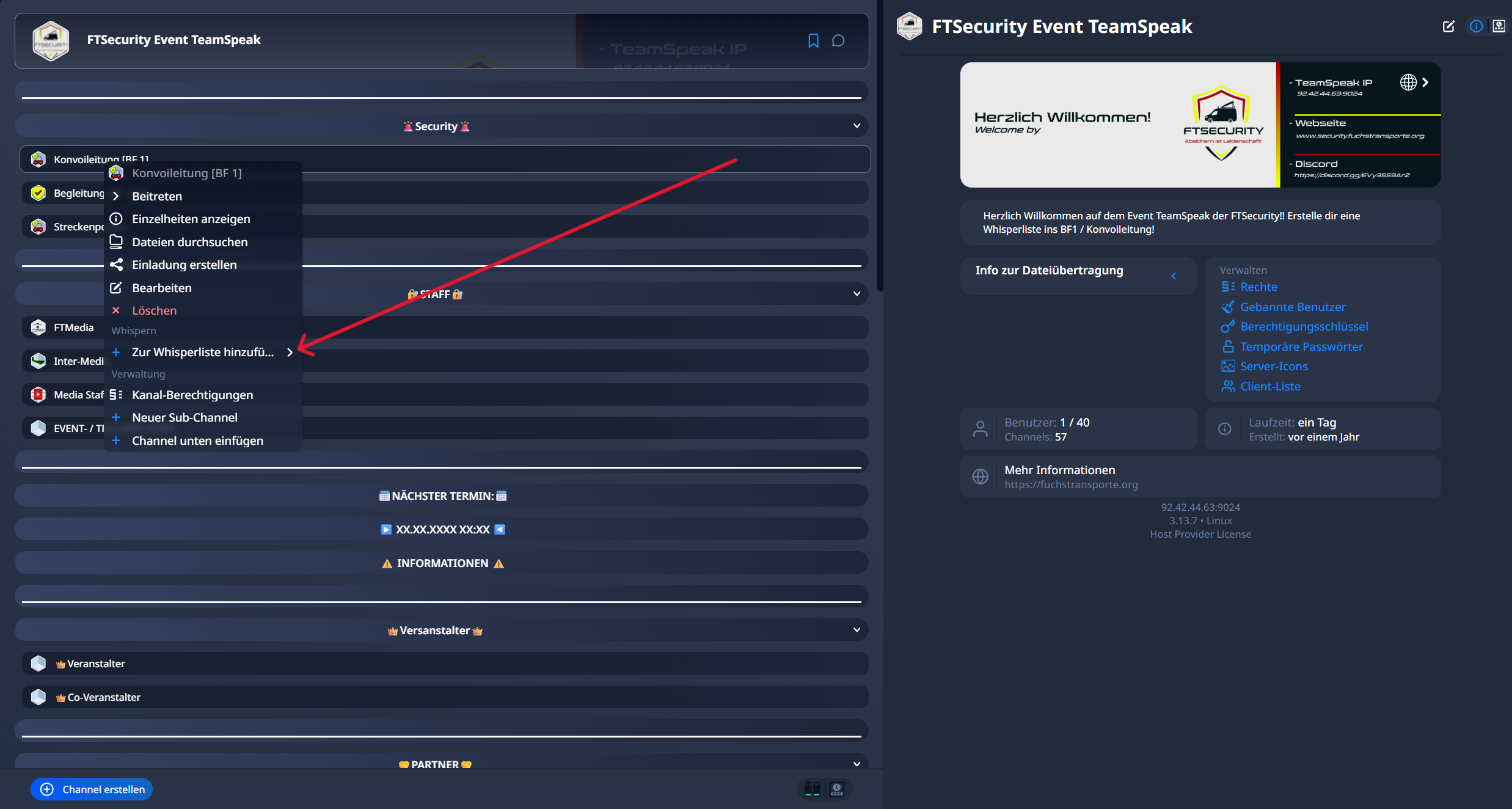 - gehe mit deiner Maus über den Kanal „Konvoileitung [BF 1]„, dann mach ein Rechtsklick und wählst „Zur Whisperliste hinzufügen“ [zeig mir ein Bild]