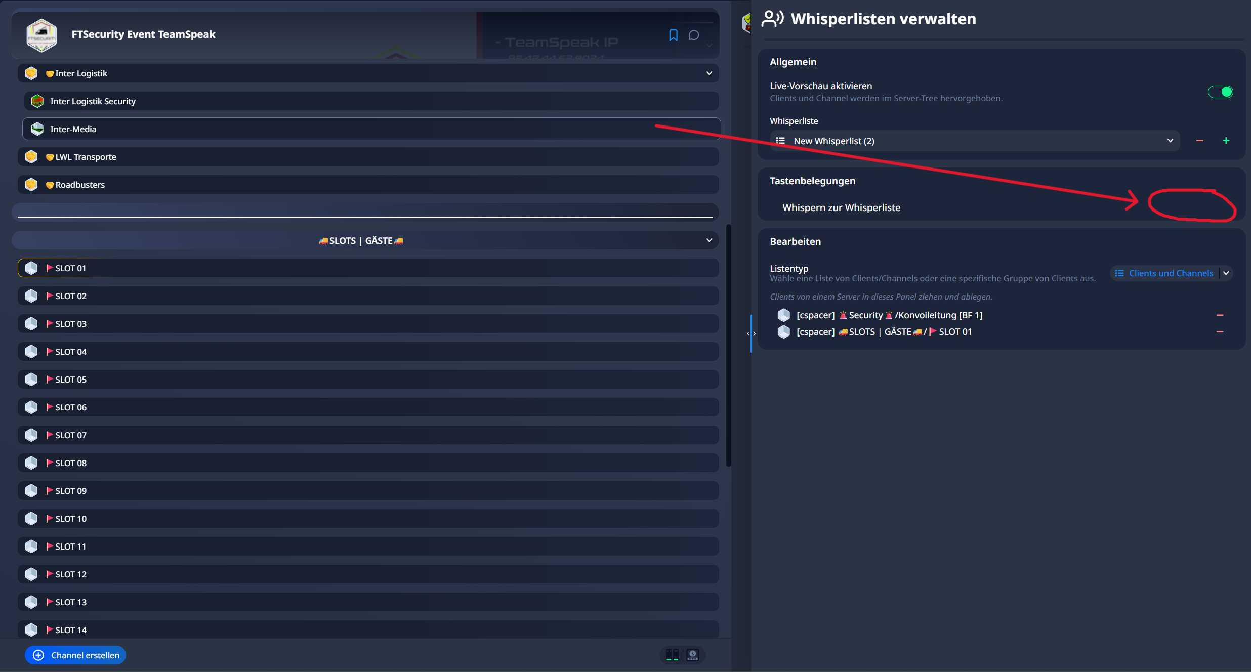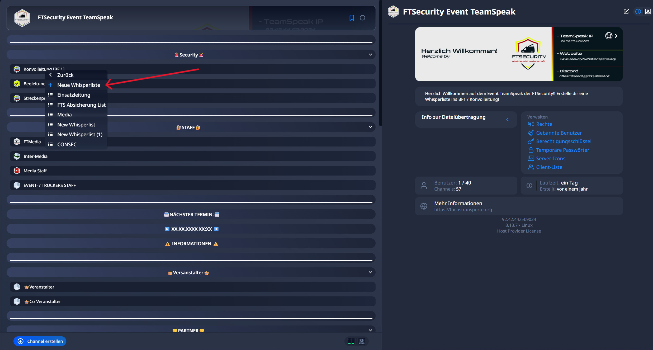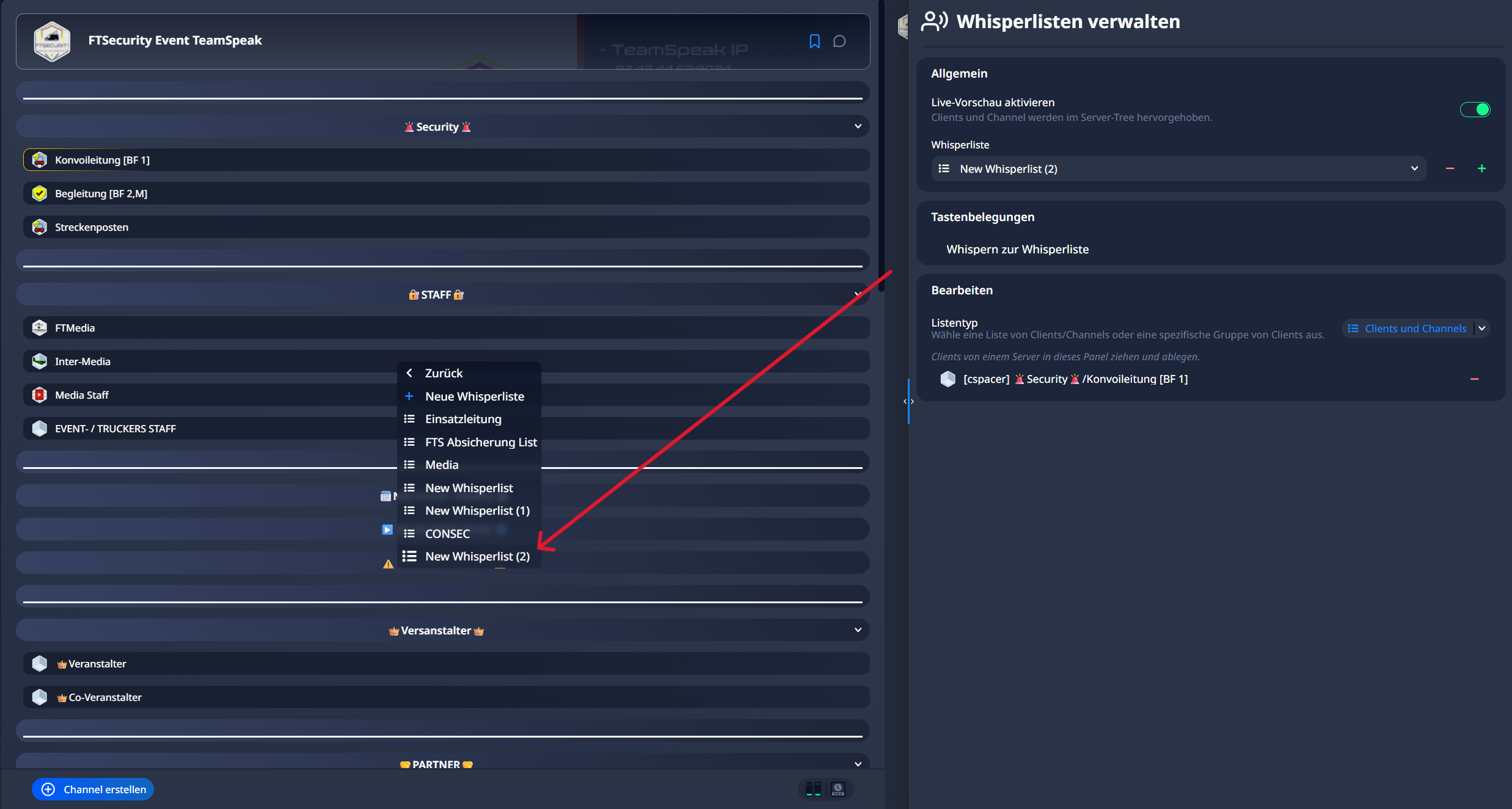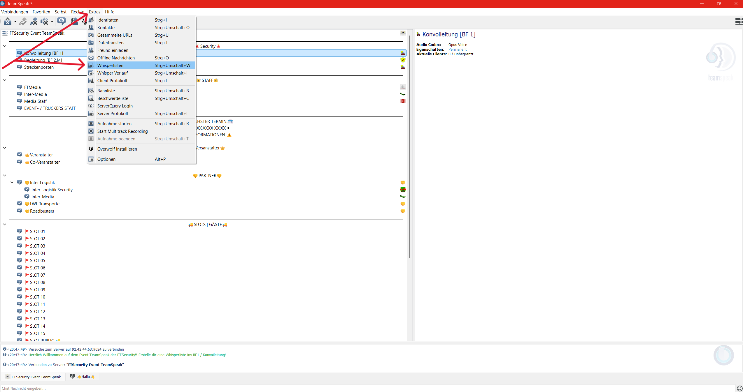 - Die Kanale kannst über die Rechteseite im Fester einfügen. Folge dazu: Unseren TS (IP / oder Speichername) > Chanal > (Doppel klick) Konvoileitung [BF 1] nun ist dieser Kanal in der Whisperliste. Dies kannst du mit beliebig vielen Kanälen machen. [zeig mir ein Bild]